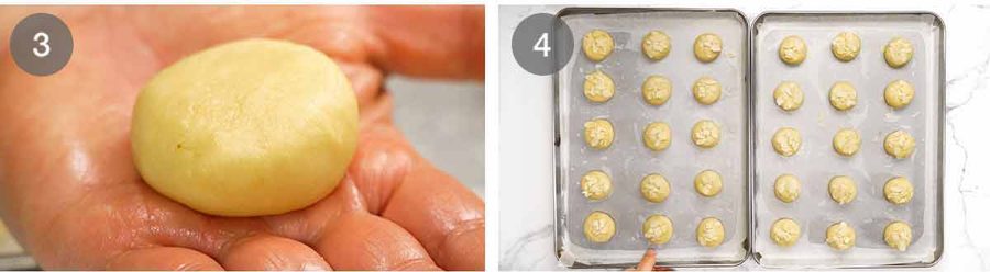 - Form cookies – Roll 30 x 2 tablespoon balls (#40 cookie scoop) then slightly flatten to about 2 cm / 0.8" thick. (Note 5 for my method). Place the cookies 4 cm / 1.6" apart on the trays. Brush the top with egg white them place a pinch of almond flakes on top (no need to press in, egg glues them on).