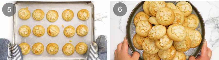 - Toast almonds 7 min at 180°C/350°F (160°C fan), cool bash or blitz. Cream butter and sugar, beat in egg and vanilla. Add dry ingredients in 3 lots, then beat in almond. Roll 30 x 2 tbsp balls (#40 scoop). Slightly flatten, brush with egg white, top with flakes. Bake 20 min until light golden.
