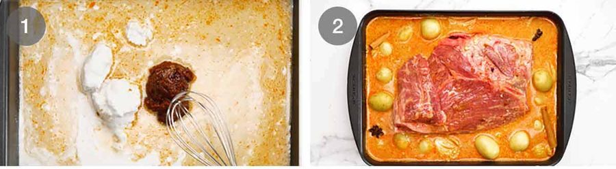 - Whisk the curry paste, coconut milk and chicken stock in a pan until lump free. Put lamb shoulder in, turn to coat in the sauce then place it so it's upside down (ie meaty / fat side down).