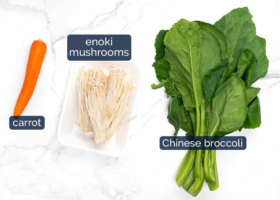 - Cook vegetables – Turn the heat up to high and bring the liquid back to a rapid simmer. Add the carrots, Chinese broccoli stems and enoki mushrooms. Cook 3 minutes. Add Chinese broccoli leaves, push in a simmer for 2 minutes until wilted.