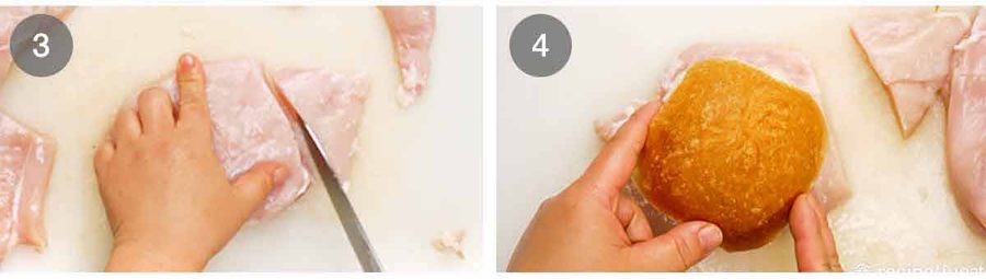 Pound to 1cm / 0.4″ thickness using a meat mallet or rollling pin.