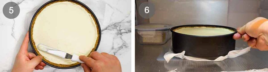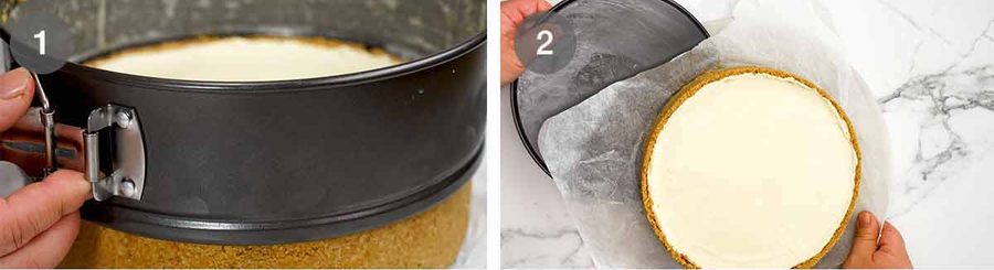 To make it easier to remove finished cheesecake, flip the base of the springform pan so it’s upside down. Why? Because this way you don’t need to worry about bumping the cheesecake over the lip of the base which could cause cracks in the crust. Instead, it will glide off smoothly!