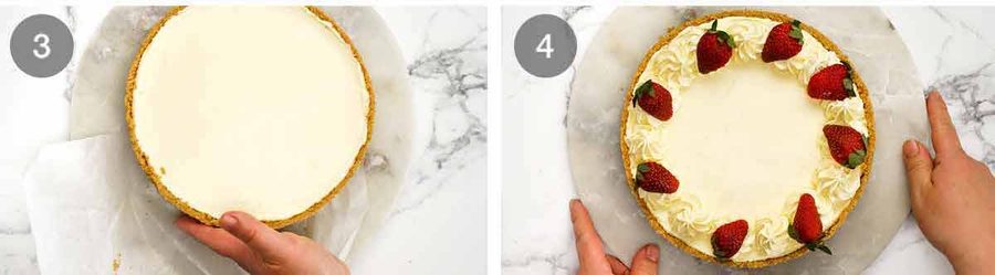 Decorate (optional) – If you’d like to decorate your cheesecake as pictured in this post, pipe whipped cream along the edge then top every second swirl with a halved strawberry. See below for more decorating ideas.