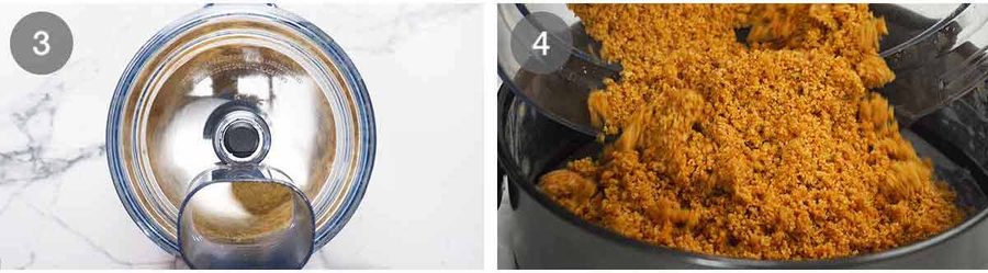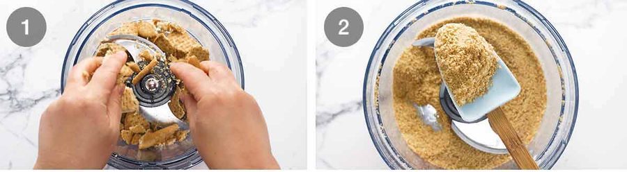 - Blitz – Break up biscuits roughly by hand and place in a food processor. Blitz until it becomes fine crumbs (~30 seconds).