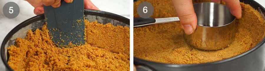 Press and neaten – Use something with a flat base and vertical walls (I use a measuring cup) to press the crumbs firmly into the walls and the base. It will seem a little fragile at this stage but once the filling is in and the cheesecake has been refrigerated, the crust becomes firm and crispy.