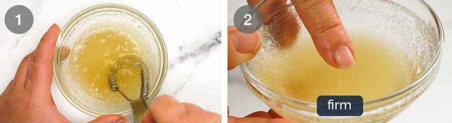 - Bloom gelatine – Put the water in a small bowl and sprinkle the gelatine across the surface (don't dump it in one place. Whisk until dissolved then set aside for 3 minute or until it firms up like rubber.