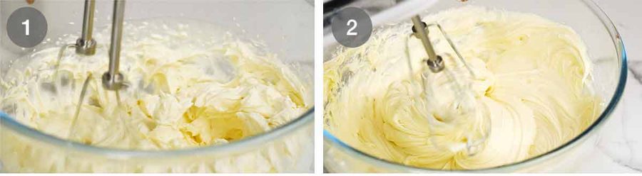 Beat cream cheese – Put the cream cheese and sugar in a separate bowl and using the same whisk (no need to clean it), beat for 1 minute on high just until it’s softly smooth. Then add the vanilla, lemon, salt and melted cooled gelatine, then beat it in just until dispersed.
