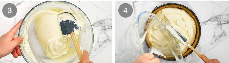 - Whip cream cheese – Put the cream cheese and sugar in a separate large bowl. Using the same beater (no need to clean), beat on high for 1 minute just until it's soft and smooth. Add the vanilla, lemon and melted gelatine, then beat for 10 seconds on high to mix it through thoroughly. Don't beat excessively as we don't want too many air bubbles in the cheesecake (unsightly).
