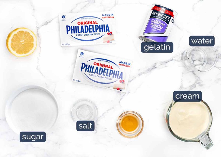Blocks not tubs – This recipe calls for cream cheese blocks which are firmer than cream cheese in tubs which are softer as they are designed for spreading. If you can only get tubs, you just need to use a little more gelatine. See notes in the recipe card for quantity.