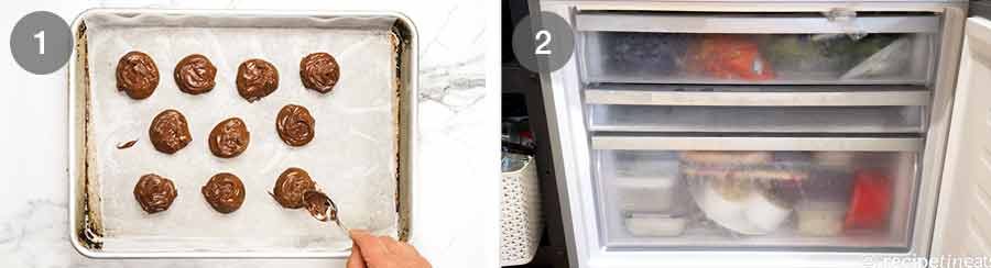 - Line a small tray with baking paper / parchment paper. Dollop Nutella on tray and spread to ~8mm/ 1/3"thick rounds. Freeze for 1 hour until firm enough to pick up.