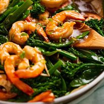 Got prawns? Got 15 minutes? Dinner is sorted with these plump and juicy prawns in a classic ginger sesame Chinese stir fry sauce, with snow peas and broccolini. It’s a Chinese restaurant standard!