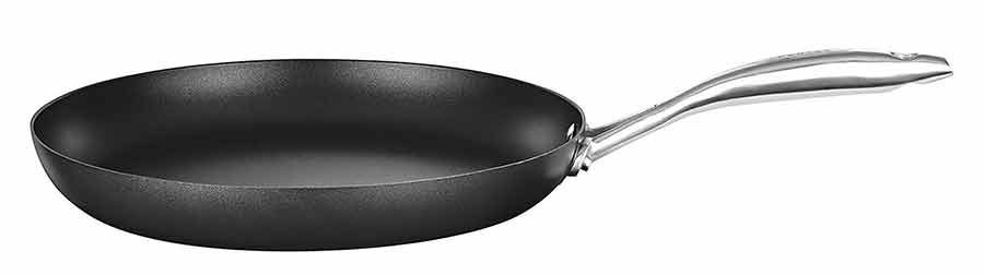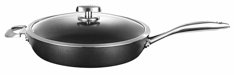 Scanpan 26cm Pro IQ Non Stick Fry Pan (RRP A$215, online for $139 here) – For pan frying chops, fish and fritters. The low sides makes it easier to turn and flip things, while the steepness of the sides means there is more flat cooking surface area; and