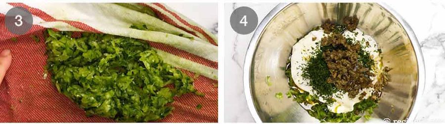 Quantity – We wanted 3/4 to 1 cup cucumber after the water has been squeezed out. Slightly more that what I use for tzatziki so it makes it a little chunkier which is a deliberate choice because this recipe is intended to be a salad.